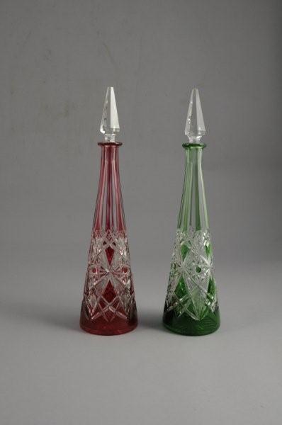 SAINT-LOUIS (?). DEUX CARAFES formant paire en cristal taillé, l'une doublé vert absinthe, l'autre rouge grenadine. De forme conique, à décor de rosaces géométrisantes, partie supérieure à pans, dessous de la base taillé d'une étoile. Bouchons à pans.