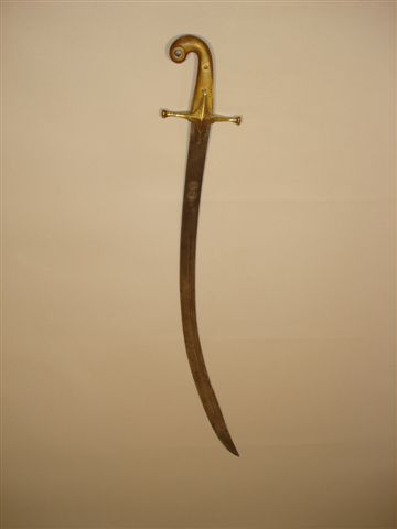 SABRE PERSAN DIT "QUILIJ". Poignée à plaquettes de corne blonde à deux boutons de rivure. Monture en laiton à deux longs quillons droits et oreillons en losange, gravés de feuillages. Lame courbe à dos rond, contre tranchant et gouttières, en damas, poinçonnée au talon.