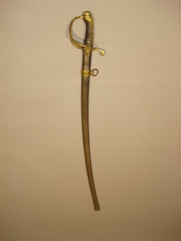 SABRE D'OFFICIER DE CAVALERIE LÉGÈRE. Poignée recouverte de basane avec filigrane. Monture en laiton ciselé. Calotte ornée de l'aigle, palmettes et feuillages sur le dos. Garde à trois branches et deux oreillons entièrement ciselés de palmes et feuillage, Lame courbe à demi-pans creux et gouttière, marquée au talon "S.H.F." et au dos "Jules Maria. fourbisseur à Paris". Fourreau en tôle de fer à un bracelet en laiton.