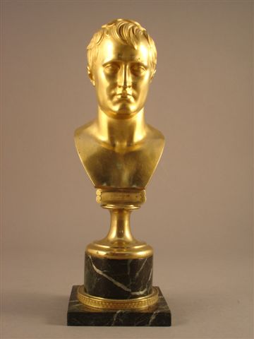 BUSTE en bronze doré représentant NAPOLÉON, d'après le sculpteur Antoine Denis CHAUDET. Piédouche en bronze doré, reposant sur une base circulaire en marbre vert à base décorée d'une frise d'entrelacs et palmettes en bronze doré et ciselé, elle-même sur une base carrée en marbre.