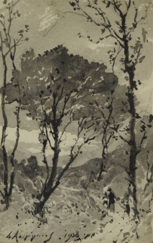 Lavis et encre, signée en bas à gauche et daté 1908.