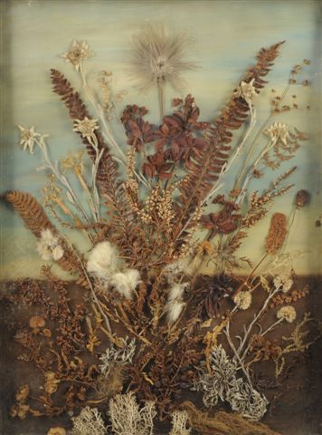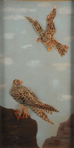 Joint : Deux encadrements représentant deux rapaces et une composition de fleurs, en végétaux séchés et plumes.