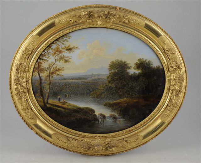 Deux fixés sous-verre polychromes de forme ovale, bombés, formant pendants.