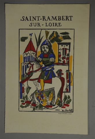 VARIA. LOT d'IMAGES D'EPINAL. Imagerie Pellerin. Pantins "Colombine" et "Polichinelle" (40,5 x 30 cm), Saint Victor (44 x 30 cm), Saint Rambert sur Loire par A. JACLET, 1966 (50 x 32 cm), Histoire naturelle : papillons (40 x 39 cm, contrecollée, tâches).