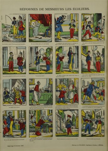 VARIA. LOT de 5 estampes comprenant : Image d'EPINAL, d'après PELLERIN. "Réforme de Messieurs les Écoliers" (45 x 32 cm). D'après LARUE et GUYOT. "1re bataille" et "2e Bataille". Deux gravures en couleur (15 x 20 cm, à vue). Estampe "le chemineau" (27 x 35 cm).