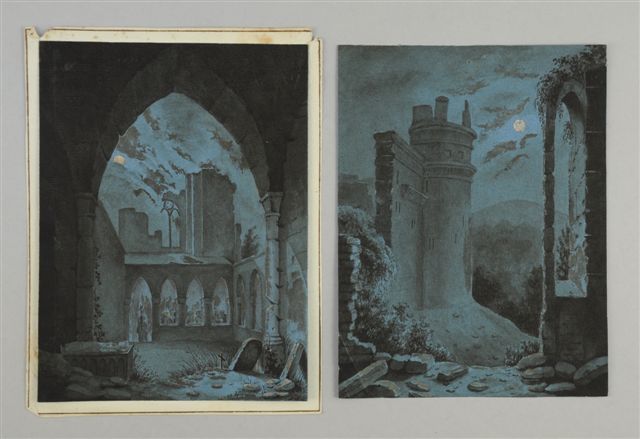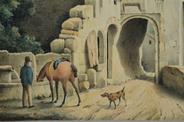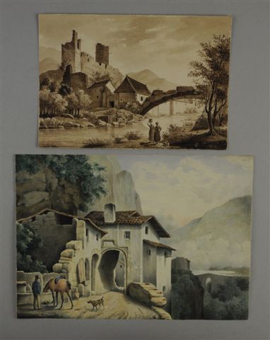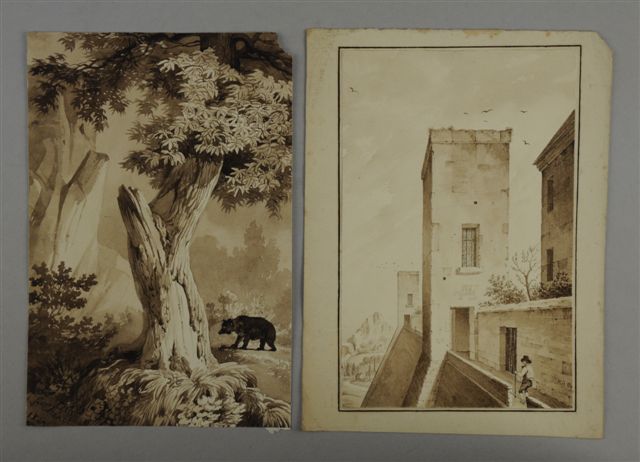 Ensemble de 29 lavis d'encre, dessins, aquarelles et croquis représentant des paysages architecturés dont des ruines, animés de personnages, l'un comportant un ours. certains monogrammés HB ou signés P. THENOT, et datés 1829, 1834.