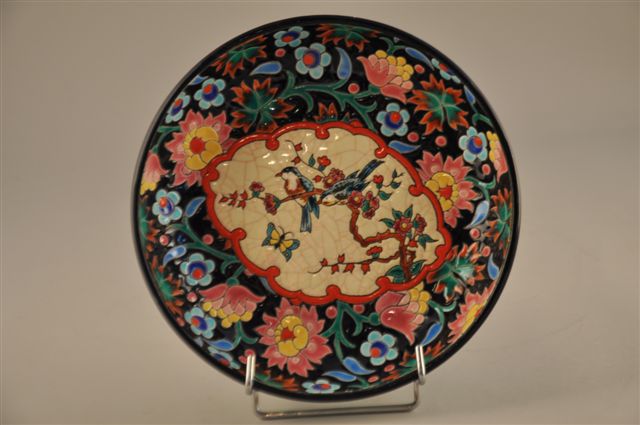 LONGWY. COUPE RONDE SUR TALON en faïence, à décor polychrome d'oiseaux branchés en réserve sur fond ivoire craquelé dans un encadrement de fleurs aux couleurs vives sur fond noir.