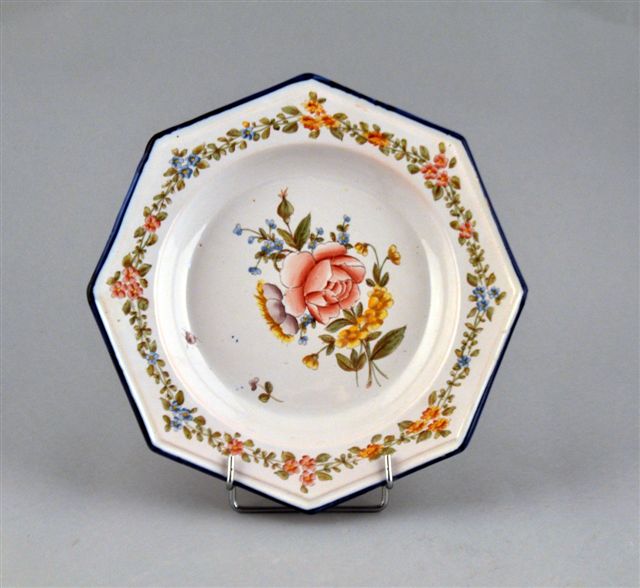 CHAROLLES. ASSIETTE OCTOGONALE À LA ROSE en faïence à pans coupés, à décor polychrome de rose, myosotis et insecte sur fond blanc dans la partie centrale et d'une guirlande de fleurs sur l'aile. Contour bleu (légères égrenures). Signature olographe bleue circa 1875, période de H. PROST.