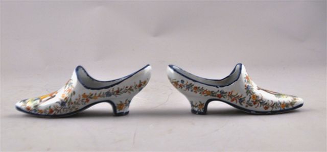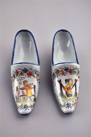 CHAROLLES. PAIRE DE CHAUSSURES en faïence, à décor polychrome dans les tons de bleu, ocre, vert et brique : sur l'une d'un enfant jouant et soufflant dans une trompe appuyé sur une barrière en bois et sur l'autre une petite fille se balançant dans un encadrement de guirlandes sur fond blanc, liseré bleu.