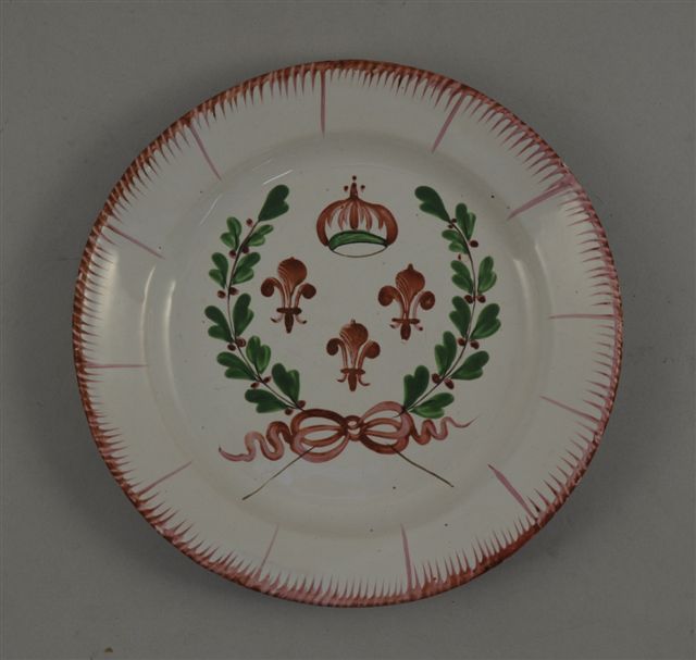 EST de la FRANCE. ASSIETTE en faïence à décor dans le bassin de trois fleurs de lys surmontées d'une couronne fermée et de lauriers noués d'un ruban. Aile à bordure au peigne. XIXème. Diam 23 cm.