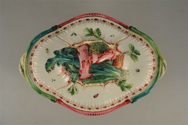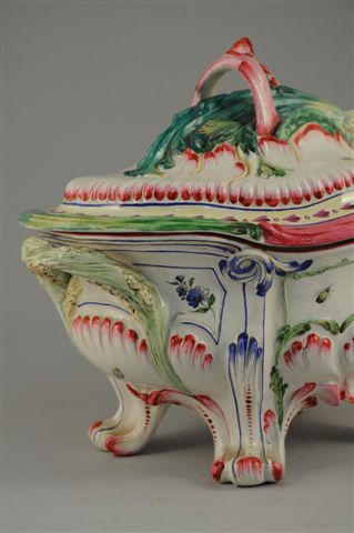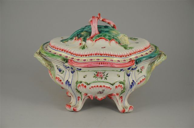 EST de la FRANCE (?). SOUPIÈRE ovale en faïence fine polychrome de forme mouvementée. Elle repose sur quatre pieds galbés. Décor peint de fleurs et d'insectes dans des encadrements. Couvercle à large prise aux légumes, d'inspiration rocaille, dans le goût du XVIIIème.