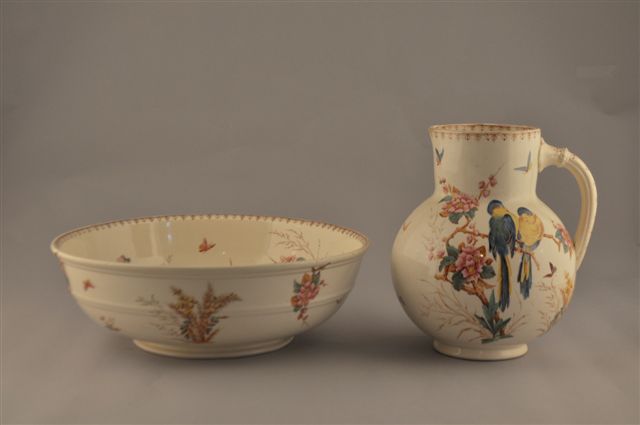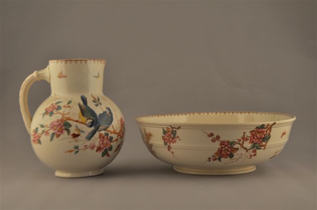 LUNÉVILLE. ENSEMBLE DE TOILETTE "MÉSANGE" en faïence, composé d'une broc pansu et d'une cuvette ronde à décor de mésanges branchées en impression de brun rehaussée de couleurs.