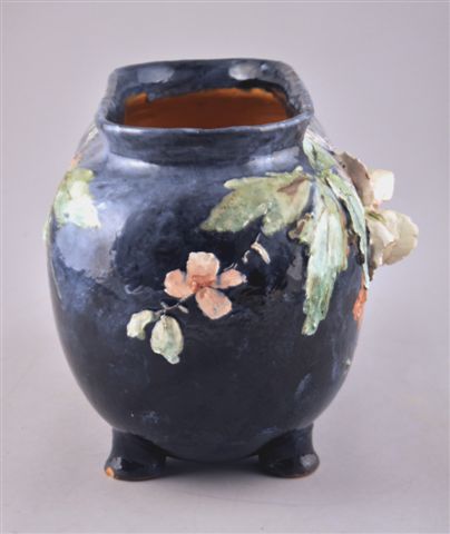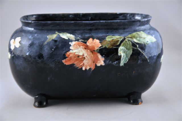 JARDINIÈRE PAR BOUQUET en céramique impressionniste, au décor à la barbotine colorée, reposant sur quatre pieds et représentant une rose aux pétales détachés du support et des fleurs d'églantines dont l'une possède deux pétales décollées. Le tout sur fond bleu profond dégradé jusqu'au bleu clair. L'intérieur de la jardinière de couleur ocre-marron (éclats à deux pieds).