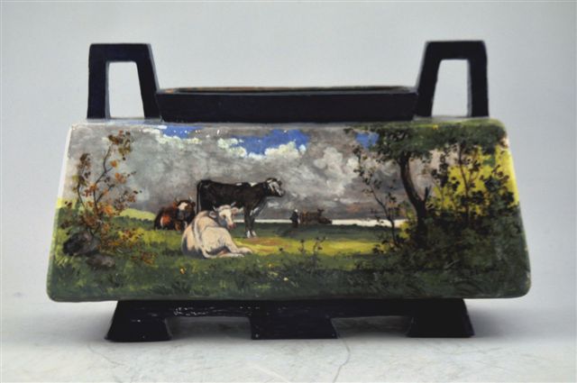JARDINIÈRE À ANSES PAR MÉNARD en céramique impressionniste à la barbotine de forme carrée reposant sur un pied découpé et décorée sur les quatre faces. Sur l'une, décor champêtre avec trois vaches, une charolaise, une normande et un hollandaise. Au deuxième plan, une fermière avec trois autre vaches et au fond la mer sous un ciel bleu nuageux. Une autre face est agrémentée d'un chemin traversant des champs vallonnés se terminant sur la mer avec, au premier plan, des arbres et des haies. Bassin de tôle. L'intérieur de la jardinière est de couleur ocre-marron si spécifique aux ateliers d'HAVILAND à Auteuil. Signé "Ménard".
