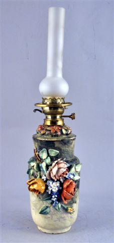 PARIS. LAMPE À HUILE PAR GILLE en céramique impressionniste, décor à la barbotine colorée de trois roses en applique et de myosotis sur un dégradé de verts (fêles au col). Signée "8094", tampon ovale en creux "E.G. / 61", pour Édouard GILLE (actif de 1868 à 1885). Seconde moitié du XIXème siècle.