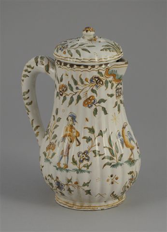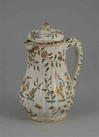 MOUSTIERS (dans le genre de). POT à EAU en faïence. Marque dans le genre d'OLERYS LAUGIER. Haut. 20 cm (sautes d'émail).