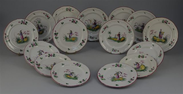 SAINT-CLÉMENT. Suite de QUINZE ASSIETTES à dessert. Décor polychrome peint "Au chinois". Aile chantournée. Marquées (différences dans les marques).