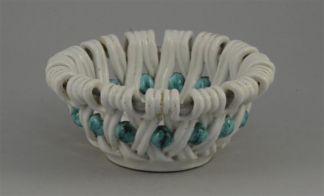 SAINTE RADÉGONDE. CORBEILLE en faïence, entrelacs alternés de sphères de couleur turquoise, en ligne. Monogrammé au revers de la bas "MC". Haut. 12, Diam. 26 cm.