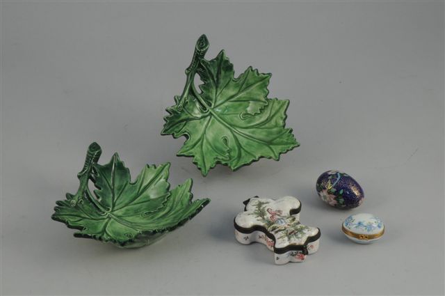 Joint : une paire d'assiettes VILLEROY & BOCH, une paire de coupelles LE CEDRE ROUGE en feuille de vigne, un oeuf en émail cloisonné, un pot couvert THOMAS et une boite en grès japonais émaillée de fleurs en forme tonneau.