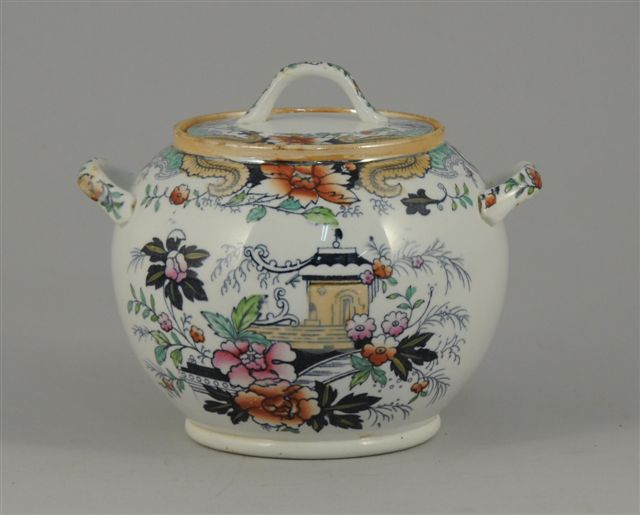 ANGLETERRE. SUCRIER de forme boule en faïence fine à décor imprimé et peint d'architecture et de fleurs dans le goût de la Chine. Haut. 13 cm (sautes d'émail à une anse)
