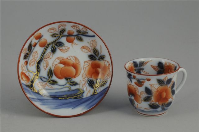 BAYEUX. TASSE ET SA SOUS-TASSE en porcelaine à décors peint en rouge et bleu inspiré de la Chine, rehaut d'or ; marque bleue à la flèche (1812-1830)