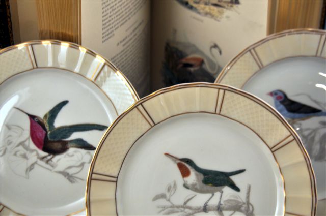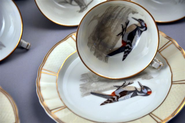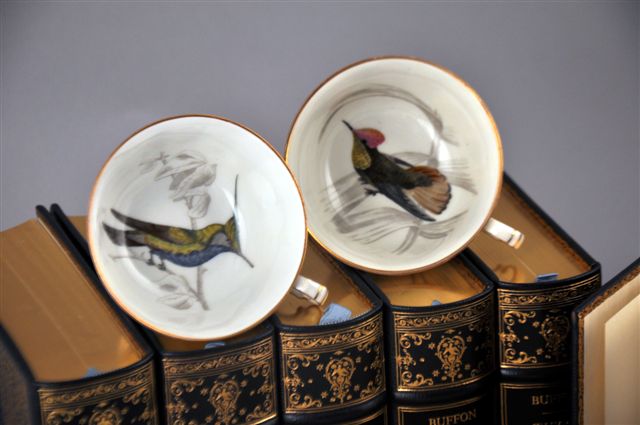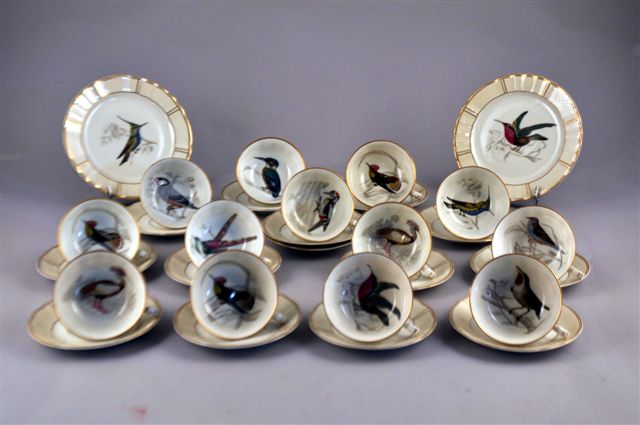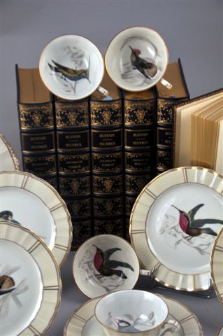 LIMOGES. SERVICE À THÉ ET À GÂTEAU AUX "OISEAUX DE BUFFON" en porcelaine à décor peint d'oiseaux, d'après ceux de l'Histoire naturelle illustrée par Buffon, comprenant : 13 tasses, 13 sous-tasses, 12 assiettes à gâteau et un plateau. On joint les quatre volumes modernes illustrés de la dite "Histoire naturelle".