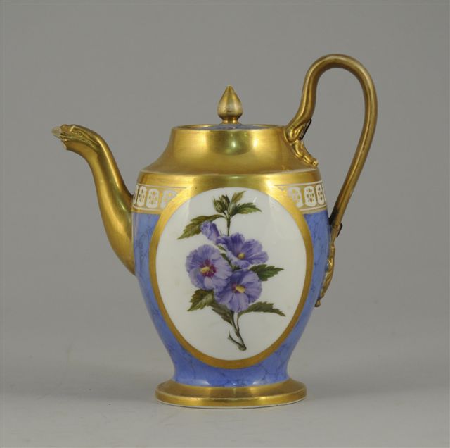 PARIS. DAGOTY. VERSEUSE en porcelaine dorée de forme ovoïde. Le corps peint en camaïeu bleu pailleté d'or, à l'imitation du marbre , à fin décor, dans une réserve ovale, d'une branche fleurie d'hibiscus bleu. Frise de motifs stylisés peint à l'or. Bec verseur zoomorphe. Attaches de l'anse en palmettes. Prise du couvercle en bouton pointu. Marque en rouge P. L. DAGOTY & E Honoré à Paris.