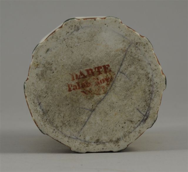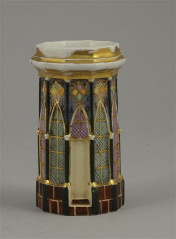 PARIS. DARTE. POT à CRAYONS en porcelaine polychrome et or de forme circulaire à décor de fenestrages brisés, de style néo-gothique. Marque en rouge "DARTE Palais Royal...".