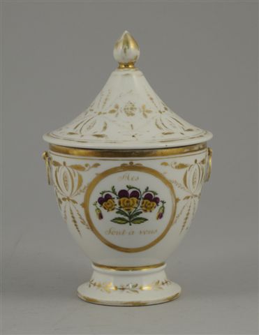 PARIS. SUCRIER en porcelaine sur piédouche. Décor sur le corps et le couvercle à l'or de frises feuillagées ornée de pampres de vigne et motifs en mansorle. Dans deux réserves circulaires, rébus à décor polychrome peint, sur une face, "Mes [pensées] sont à vous", et, sur l'autre face ""Recevez ce [bouquet], l'amitié vous l'offre". Anses latérales en anneau simulés. Prise du couvercle en bouton pointu.