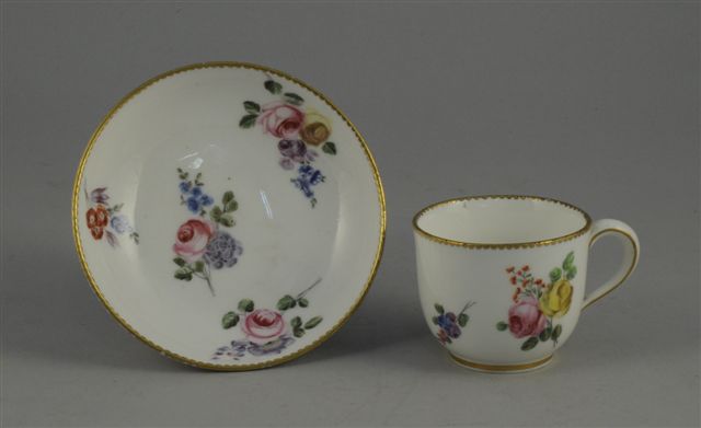 SEVRES (?). TASSE ET SA SOUS-TASSE en porcelaine à décors de fleurs émaillée et d'un filet doré de dents de loup ; marque apocryphes en bleu : de Sèvres lettre K (1763), de peintres CAPELLE (1746-1800) sur la tasse et ROCHER Alexandre (1758-1759) sur la soucoupe.
