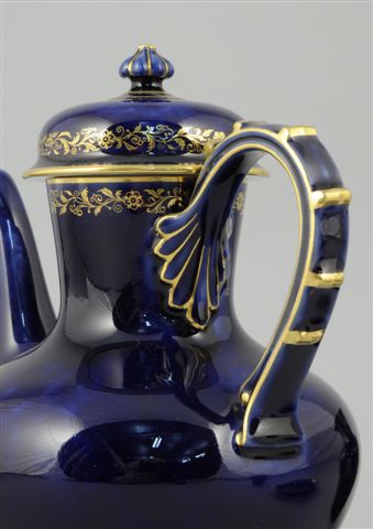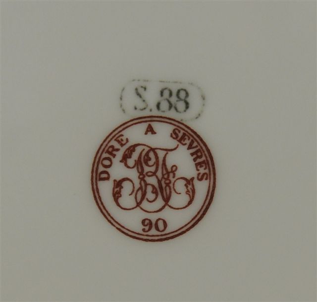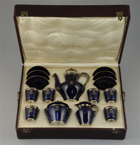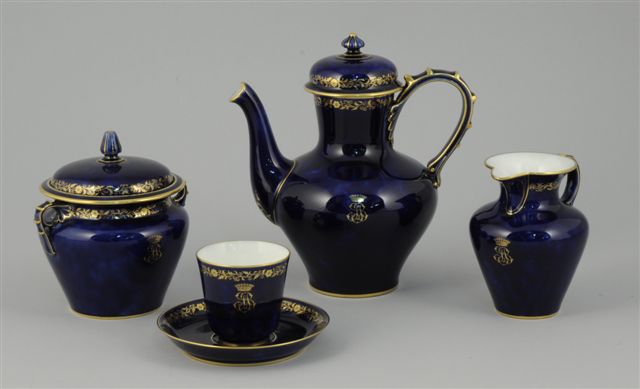 Comprenant une cafetière, un sucrier, un pot à lait, une suite de six tasses à corps légèrement évasé, et leurs sous-tasses. Fond bleu nuagé, décor or de frises florales et monogramme "SB" surmonté d'une couronne comtale. Marques de forme de 84 à 89. Marque de dorure pour 1890.