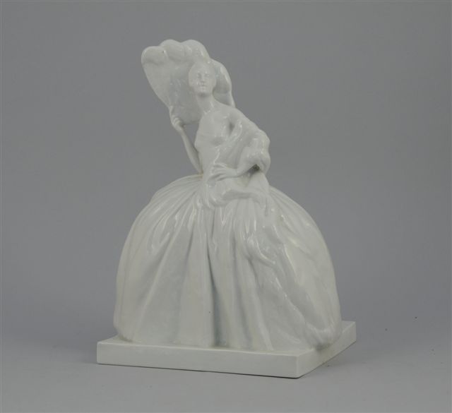 Élégante à l'éventail. Porcelaine. Signée en creux et marque aux flèches croisées en bleu "29"