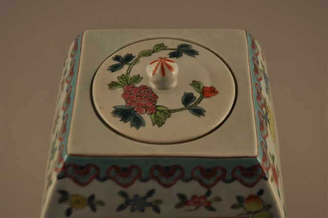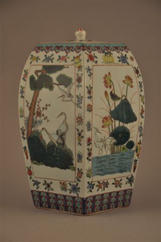 JAPON. VASE COUVERT à quatre pans en faïence, à décor japonisant d'oiseaux et de végétation dans des médaillons en réserve de fleurs, sur un fond nacré bleu encadré au sommet et en bas de frises géométriques. Petit couvercle rond surmonté d'un fretel naturaliste.