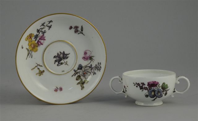 MEISSEN (?). TASSE A DEUX ANSES et une sous-tasse en porcelaine à décors floraux, liséré d'or ; marque aux épés croisées sous la sous-tasse et à deux points sous la tasse.