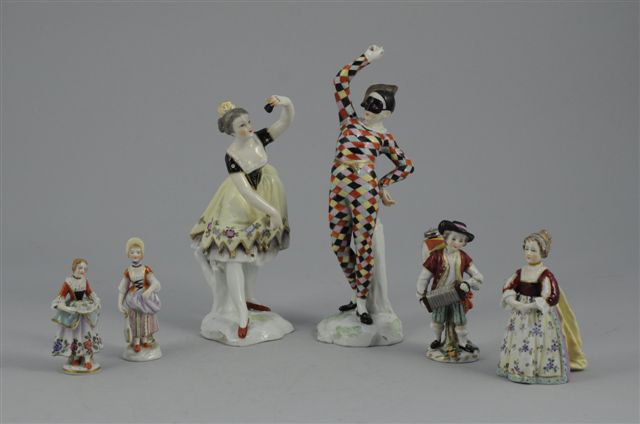 VARIA. Six PERSONNAGES en porcelaine polychrome. Danseuse aux castagnettes (Haut. 18,5 cm, accident), Arlequin dansant (Haut. 22 cm, manque ?), musicien (Haut. 10,5 cm, petits manques), jeune fille (Haut. 10,5 cm, accident et restauration), deux servantes (Haut. 8 et 9 cm, têtes rapportées?). Marques de MEISSEN, "CI" sous couronne et "H".