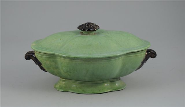 VARIA. SOUPIÈRE de forme ovale en terre blanche vernissée vert, le corps et le couvercle quadrilobés, prise du couvercle en rosace et anses latérales en volute feuillagée à glaçure brune. Haut. 18, Long. 35, Larg. 20 cm. (quelques sautes d'émail)