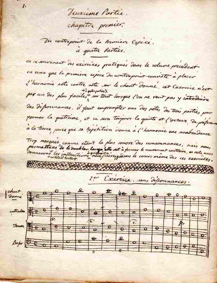 " La clarté, et la précision, voilà, depuis longtems, ce qu'on desire trouver dans un Traité de composition. Tous les traités qui on paru jusqu'à ce jour, soit en France, en Allemagne, ou en Italie ; renferment des principes très-scientifiques, appuyés sur differents systêmes ; mais aucun n'a su indiquer au lecteur la maniere de s'y prendre pour composer un chant quelconque, ni bien expliqué celle de mettre divers accompagnements sur un chant donné. Ceux qui savent, sont les seuls qui comprennent bien la beauté des exemples [...]. Outre le livre, il leur faut un maître qui l'explique ; et souvent ce maître, etant, par système, d'une opinion contraire à l'auteur du livre, il le critique au lieu de l'expliquer, le désaprouve, embrouille tout ; et l'amateur decouragé s'ennuie, prend de l'humeur, et murmure quelquesfois tout bas que, les compositions musicales ne se produisent que par routine, ou par inspiration "... Les auteurs du Traité de la composition se targuent de donner à l'élève tout " le matériel de cette science ", afin qu'il l'exerce avec correction. Ils s'interrompent au bord du contrepoint figuré, " qui est la sixieme et derniere espèce et qui contient tout ce que le savantisme musical a inventé depuis plusieurs siecles. Mais reprenons un moment aleine, pour avoir le courage de parcourir ce nouveau labyrinte "...