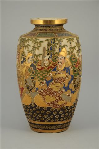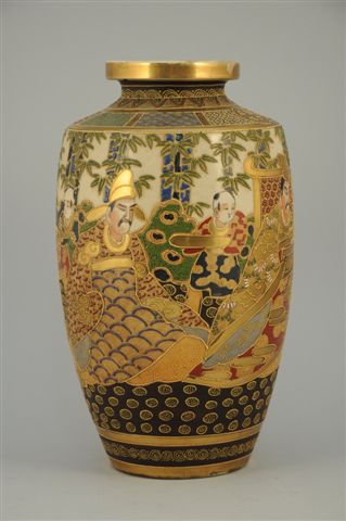 VASE BALUSTRE en faïence à décor de scènes de cour. Satzuma. Fin XIXème, début XXème. Haut 39 cm.