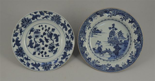 Deux ASSIETTES. La première, creuse, à décor en bleu d'un paysage. La seconde à décor en bleu floral.