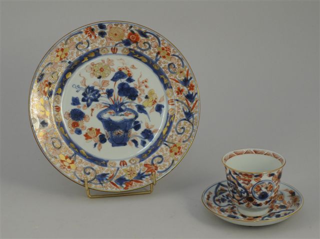 ASSIETTE en porcelaine à décor floral imari bleu et rouge rehaussé à l'or ; marques "co I/C"