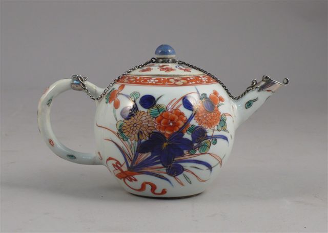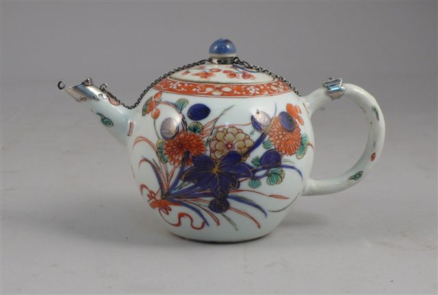 THÉIÈRE en porcelaine de forme sphérique à décor floral polychrome et or. Prise du couvercle en boule, monture argent portant un poinçon à la fleur de lys (1684-1687 ?) Imari. XVIIIème. Haut. 11 cm (accident et restauration à l'anse)