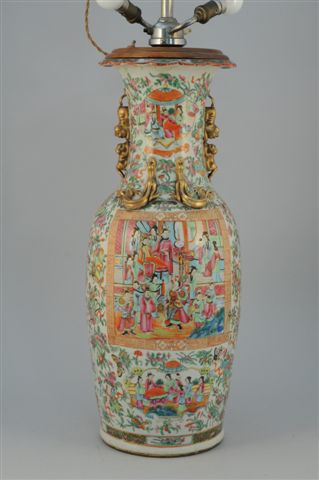 VASE en porcelaine à décor polychrome et or de médaillons de personnages et fleurs. Canton, XIXème.
