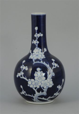 VASE bouteille en porcelaine décorée en bleu sous couverte de branches de cerisiers stylisées. Chine. XXème siècle. Haut. 24 cm. Joint un petit vase en porcelaine.