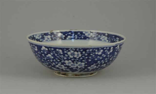 CHINE. XIXème. BOL en porcelaine bleu et blanc à décor de pruniers enfleurs.