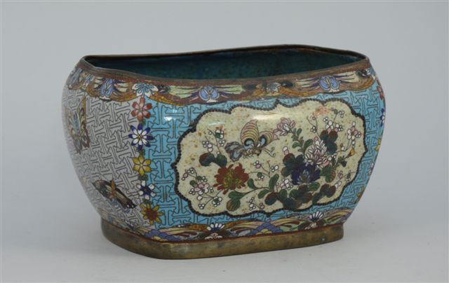 JARDINIÈRE en émail cloisonné de forme galbée. Décor dans des réserves de papillons, oiseau et fleurs, sur fond turquoise et parme.