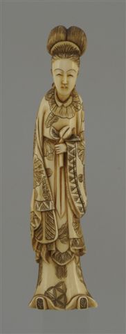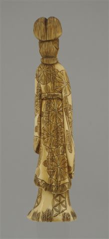 OKIMONO en ivoire sculpté et gravé représentant une geisha tenant...