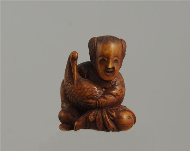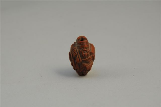 LOT comprenant un NETSUKE en ivoire sculpté teinté figurant un homme assis tenant un échassier (Haut. 3 cm) et ELEMENT d'inro ou de nestuke de forme ovoïde en buis sculpté figurant un viel homme (Long. 3 cm). XIXème.