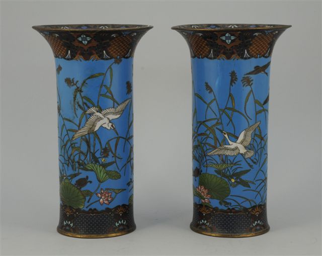 Paire de VASES rouleau en cloisonné à décor de grues et lotus sur fond bleu. Japon, vers 1900. Haut. 29,5 cm