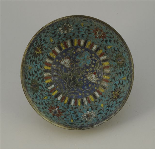 Paire de bols en bronze et émaux cloisonnés à décor de lotus et rinceaux sur fond bleu turquoise. Chine, époque Ming, XVIIe.