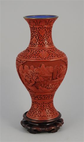 VASE dans le genre laque de Pékin. Décor de paysages. Intérieur en émail bleu. Haut. 32 cm.